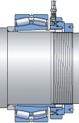 Los manguitos de desmontaje pueden utilizarse para montar rodamientos con un agujero cónico sobre el asiento cilíndrico de los ejes escalonados (fig. 1). El manguito se inserta a presión en el agujero del aro interior del rodamiento, que hace tope con un resalte del eje o un componente fijo similar. El manguito se fija sobre el eje mediante una tuerca o una placa de fijación. Las tuercas de fijación KM o HM (→ Tuercas de fijación) con dispositivos de fijación adecuados son apropiadas. Las tuercas de fijación no se suministran con el manguito y deben pedirse por separado. SKF no fabrica placas de fijación.